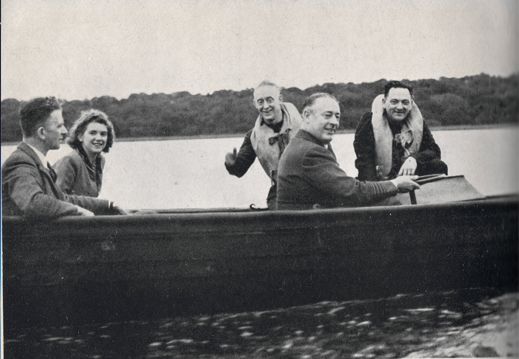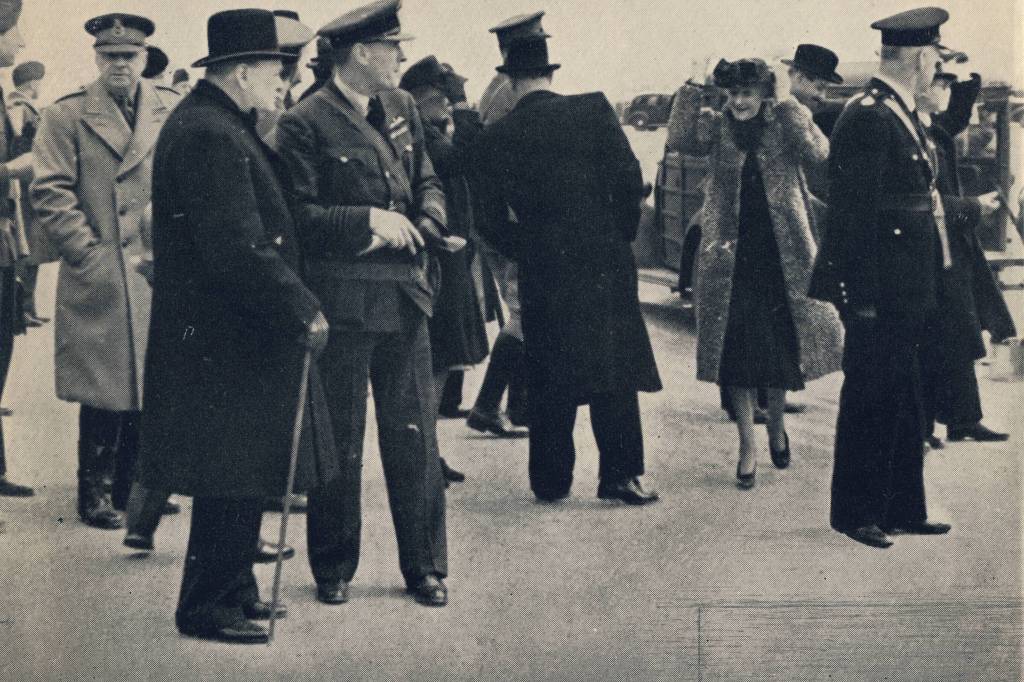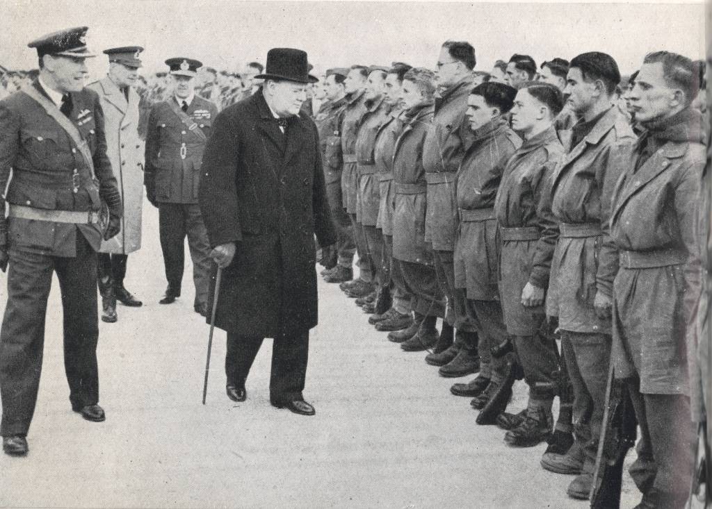 With Mrs. ChurchillMr. and Mrs. Churchill, General Ismay, and Mr Averill Harriman USA, visit the Parachute School, Ringway, in April 1941. Group Captain “Stiffey” Harvey shows them round.