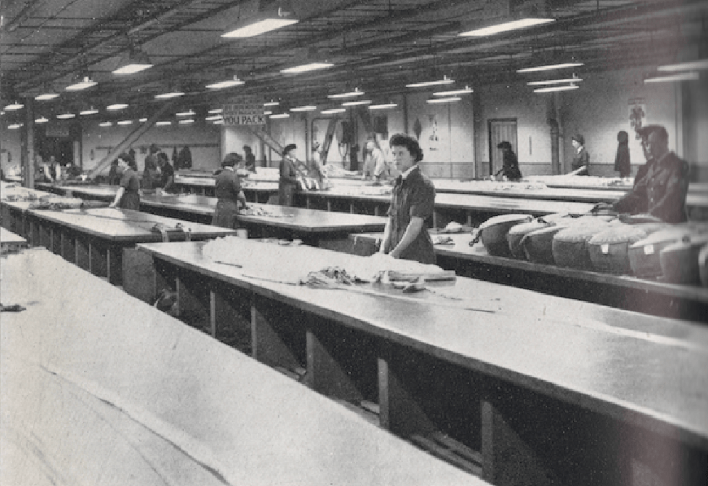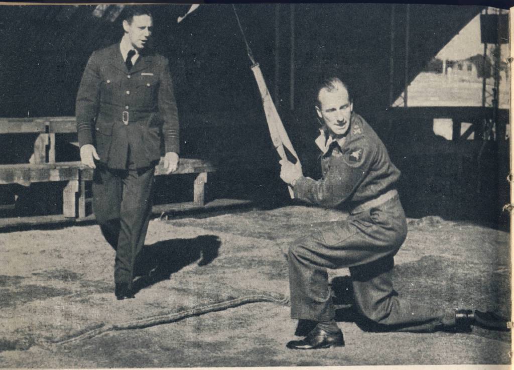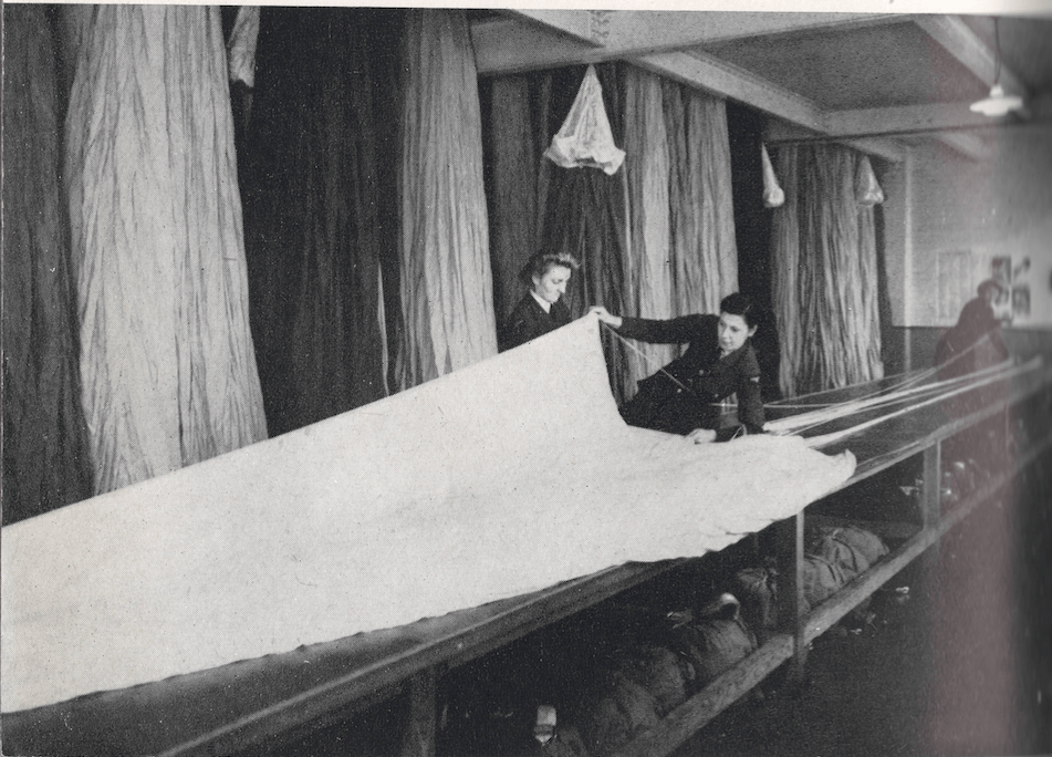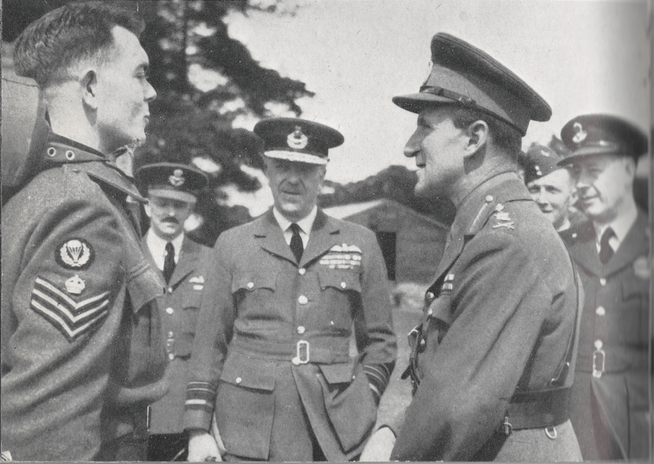 Whitley exit trainingMockupChief Instructor John Kilkenny gives personal instruction to Major General Eric BolsA Flight Sergeant PJI with Air Marshall Sir Arthur Barratt and General Sir Bernard Paget. Note PJI arm badge pre-brevetPacking hallUnder supervision.
